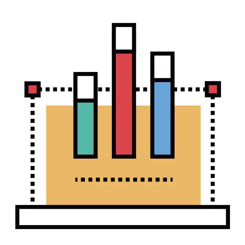 <svg width="800px" height="800px" viewBox="0 0 1024 1024" class="icon" version="1.1" xmlns="http://www.w3.org/2000/svg"><path d="M135.3 373h753.1v493H135.3z" fill="#FFFFFF" /><path d="M880.5 365h16v16h-16zM864.8 381h-15.7v-16h15.7v16z m-31.4 0h-15.7v-16h15.7v16z m-31.3 0h-15.7v-16h15.7v16z m-31.4 0H755v-16h15.7v16z m-31.4 0h-15.7v-16h15.7v16z m-31.3 0h-15.7v-16H708v16z m-31.4 0h-15.7v-16h15.7v16z m-31.4 0h-15.7v-16h15.7v16z m-31.3 0h-15.7v-16h15.7v16z m-31.4 0h-15.7v-16h15.7v16z m-31.4 0h-15.7v-16h15.7v16z m-31.4 0H504v-16h15.7v16z m-31.3 0h-15.7v-16h15.7v16z m-31.4 0h-15.7v-16H457v16z m-31.4 0H410v-16h15.7v16z m-31.3 0h-15.7v-16h15.7v16z m-31.4 0h-15.7v-16h15.7v16z m-31.4 0h-15.7v-16h15.7v16z m-31.3 0h-15.7v-16h15.7v16z m-31.4 0h-15.7v-16h15.7v16z m-31.4 0h-15.7v-16h15.7v16z m-31.3 0h-15.7v-16h15.7v16z m-31.4 0H159v-16h15.7v16zM127.3 365h16v16h-16zM143.3 841.5h-16v-16.4h16v16.4z m0-32.9h-16v-16.4h16v16.4z m0-32.8h-16v-16.4h16v16.4z m0-32.9h-16v-16.4h16v16.4z m0-32.9h-16v-16.4h16V710z m0-32.9h-16v-16.4h16v16.4z m0-32.9h-16v-16.4h16v16.4z m0-32.9h-16v-16.4h16v16.4z m0-32.9h-16V562h16v16.4z m0-32.9h-16v-16.4h16v16.4z m0-32.9h-16v-16.4h16v16.4z m0-32.9h-16v-16.4h16v16.4z m0-32.9h-16v-16.4h16v16.4z m0-32.9h-16v-16.4h16v16.4zM127.3 858h16v16h-16zM864.8 874h-15.7v-16h15.7v16z m-31.4 0h-15.7v-16h15.7v16z m-31.3 0h-15.7v-16h15.7v16z m-31.4 0H755v-16h15.7v16z m-31.4 0h-15.7v-16h15.7v16z m-31.3 0h-15.7v-16H708v16z m-31.4 0h-15.7v-16h15.7v16z m-31.4 0h-15.7v-16h15.7v16z m-31.3 0h-15.7v-16h15.7v16z m-31.4 0h-15.7v-16h15.7v16z m-31.4 0h-15.7v-16h15.7v16z m-31.4 0H504v-16h15.7v16z m-31.3 0h-15.7v-16h15.7v16z m-31.4 0h-15.7v-16H457v16z m-31.4 0H410v-16h15.7v16z m-31.3 0h-15.7v-16h15.7v16z m-31.4 0h-15.7v-16h15.7v16z m-31.4 0h-15.7v-16h15.7v16z m-31.3 0h-15.7v-16h15.7v16z m-31.4 0h-15.7v-16h15.7v16z m-31.4 0h-15.7v-16h15.7v16z m-31.3 0h-15.7v-16h15.7v16z m-31.4 0H159v-16h15.7v16zM880.5 858h16v16h-16zM896.5 841.5h-16v-16.4h16v16.4z m0-32.9h-16v-16.4h16v16.4z m0-32.8h-16v-16.4h16v16.4z m0-32.9h-16v-16.4h16v16.4z m0-32.9h-16v-16.4h16V710z m0-32.9h-16v-16.4h16v16.4z m0-32.9h-16v-16.4h16v16.4z m0-32.9h-16v-16.4h16v16.4z m0-32.9h-16V562h16v16.4z m0-32.9h-16v-16.4h16v16.4z m0-32.9h-16v-16.4h16v16.4z m0-32.9h-16v-16.4h16v16.4z m0-32.9h-16v-16.4h16v16.4z m0-32.9h-16v-16.4h16v16.4z" fill="#0A0408" /><path d="M192.7 440.7h645.2v454.9H192.7z" fill="#EBB866" /><path d="M71.9 864.5H952v83.9H71.9z" fill="#FFFFFF" /><path d="M959.9 956.4h-896v-99.9H960v99.9z m-880-16H944v-67.9H79.9v67.9z" fill="#0A0408" /><path d="M314.5 334.1h84.4v319.7h-84.4z" fill="#55B7A8" /><path d="M406.9 661.8H306.5V326.1h100.4v335.7z m-84.4-16h68.4V342.1h-68.4v303.7z" fill="#0A0408" /><path d="M475.3 145.7h84.4v508.1h-84.4z" fill="#DC444A" /><path d="M567.6 661.8H467.3V137.7h100.4v524.1z m-84.3-16h68.4V153.7h-68.4v492.1z" fill="#0A0408" /><path d="M636 241.8h84.4v412H636z" fill="#68A4D9" /><path d="M728.4 661.8H628v-428h100.4v428z m-84.4-16h68.4v-396H644v396z" fill="#0A0408" /><path d="M314.5 308.7h84.4v110.8h-84.4z" fill="#FFFFFF" /><path d="M406.9 427.5H306.5V300.7h100.4v126.8z m-84.4-16h68.4v-94.8h-68.4v94.8z" fill="#0A0408" /><path d="M475.3 104h84.4v110.8h-84.4z" fill="#FFFFFF" /><path d="M567.6 222.8H467.3V96h100.4v126.8z m-84.3-16h68.4V112h-68.4v94.8z" fill="#0A0408" /><path d="M636 223.3h84.4v110.8H636z" fill="#FFFFFF" /><path d="M728.4 342.1H628V215.3h100.4v126.8z m-84.4-16h68.4v-94.8H644v94.8z" fill="#0A0408" /><path d="M314.5 742.2h8v16h-8zM696.8 758.2h-15.6v-16h15.6v16z m-31.2 0H650v-16h15.6v16z m-31.2 0h-15.6v-16h15.6v16z m-31.2 0h-15.6v-16h15.6v16z m-31.2 0h-15.6v-16H572v16z m-31.2 0h-15.6v-16h15.6v16z m-31.1 0h-15.6v-16h15.6v16z m-31.2 0h-15.6v-16h15.6v16z m-31.2 0h-15.6v-16h15.6v16z m-31.2 0h-15.6v-16h15.6v16z m-31.2 0h-15.6v-16h15.6v16z m-31.2 0h-15.6v-16h15.6v16zM712.4 742.2h8v16h-8z" fill="#0A0408" /><path d="M109.9 347.6h50.9v50.9h-50.9z" fill="#DC444A" /><path d="M168.8 406.5h-66.9v-66.9h66.9v66.9z m-50.9-16h34.9v-34.9h-34.9v34.9z" fill="#0A0408" /><path d="M863.7 346.9h50.9v50.9h-50.9z" fill="#DC444A" /><path d="M922.6 405.7h-66.9v-66.9h66.9v66.9z m-50.9-16h34.9v-34.9h-34.9v34.9z" fill="#0A0408" /></svg>