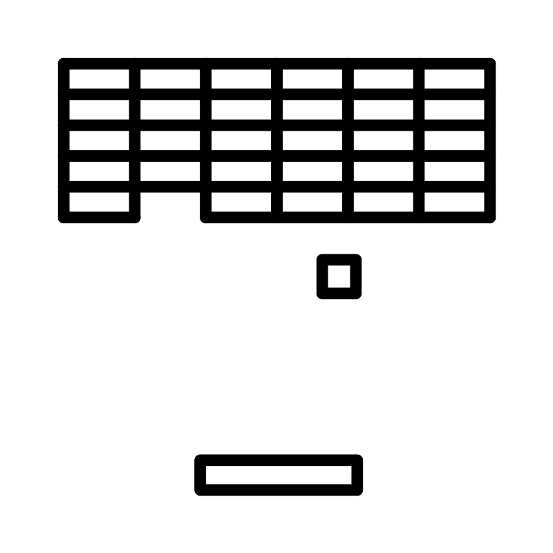 <svg width="800px" height="800px" viewBox="0 0 48 48" xmlns="http://www.w3.org/2000/svg"><defs><style>.a{fill:none;stroke:#000000;stroke-linecap:round;stroke-linejoin:round;}</style></defs><rect class="a" x="17.35" y="39.92" width="13.63" height="2.58"/><rect class="a" x="27.94" y="22.52" width="2.92" height="2.92"/><line class="a" x1="11.67" y1="5.5" x2="11.67" y2="18.85"/><line class="a" x1="5.5" y1="5.5" x2="5.5" y2="18.85"/><line class="a" x1="17.83" y1="5.5" x2="17.83" y2="18.85"/><line class="a" x1="24" y1="5.5" x2="24" y2="18.85"/><line class="a" x1="30.17" y1="5.5" x2="30.17" y2="18.85"/><line class="a" x1="36.33" y1="5.5" x2="36.33" y2="18.85"/><line class="a" x1="42.5" y1="5.5" x2="42.5" y2="18.85"/><line class="a" x1="5.5" y1="8.17" x2="42.5" y2="8.17"/><line class="a" x1="5.5" y1="10.84" x2="42.5" y2="10.84"/><line class="a" x1="5.5" y1="13.51" x2="42.5" y2="13.51"/><line class="a" x1="5.5" y1="16.18" x2="42.5" y2="16.18"/><line class="a" x1="5.5" y1="5.5" x2="42.5" y2="5.5"/><line class="a" x1="11.67" y1="18.85" x2="5.5" y2="18.85"/><line class="a" x1="17.83" y1="18.85" x2="42.5" y2="18.85"/></svg>