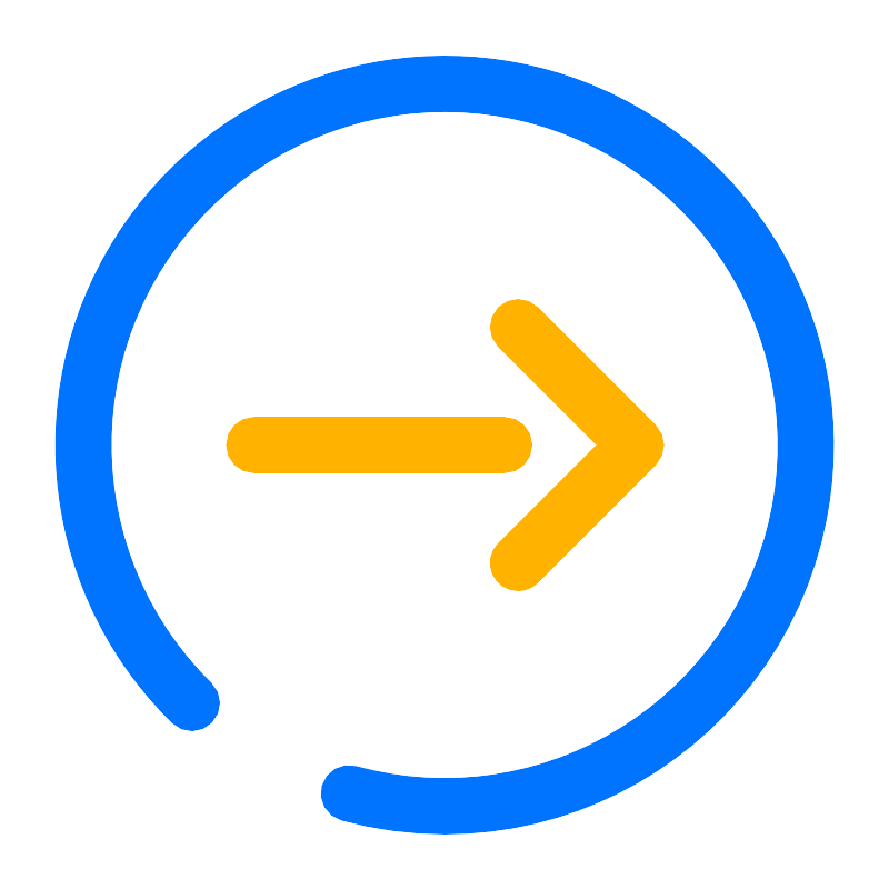 <svg width="800px" height="800px" viewBox="0 0 64 64" data-name="Layer 1" id="Layer_1" xmlns="http://www.w3.org/2000/svg"><defs><style>.cls-1{fill:#0074ff;}.cls-2{fill:#ffb300;}</style></defs><title/><path class="cls-1" d="M32,60a28.29,28.29,0,0,1-7.45-1,2,2,0,0,1,1.06-3.86,24,24,0,1,0-10.44-6A2,2,0,0,1,12.37,52,28,28,0,1,1,32,60Z"/><path class="cls-2" d="M36.26,34h-18a2,2,0,0,1,0-4h18a2,2,0,0,1,0,4Z"/><path class="cls-2" d="M37.26,42.49a2,2,0,0,1-1.42-3.42L42.91,32l-7.07-7.07a2,2,0,0,1,2.83-2.83l8.49,8.49a2,2,0,0,1,0,2.82L38.67,41.9A2,2,0,0,1,37.26,42.49Z"/></svg>