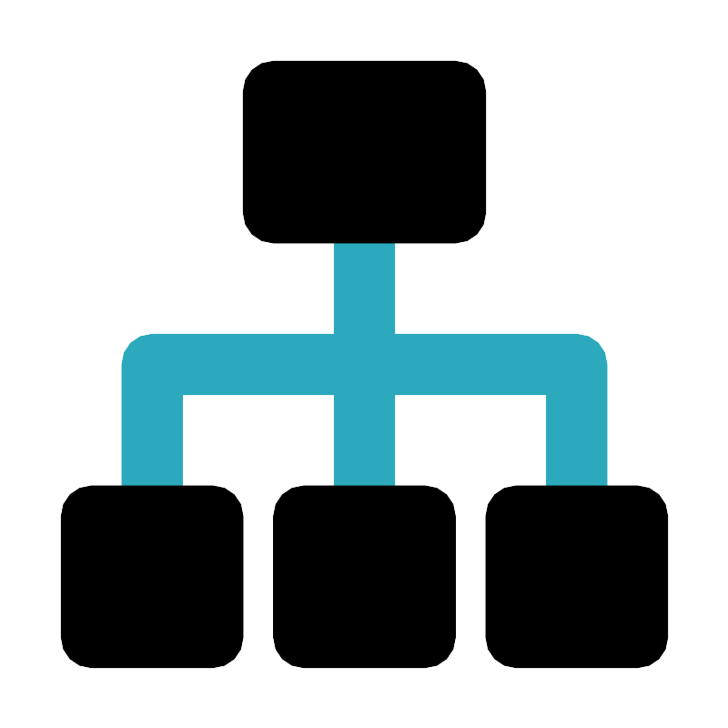 <svg fill="#000000" width="800px" height="800px" viewBox="0 0 24 24" id="roadmap" data-name="Flat Color" xmlns="http://www.w3.org/2000/svg" class="icon flat-color"><path id="secondary" d="M19,11H13V7a1,1,0,0,0-2,0v4H5a1,1,0,0,0-1,1v5a1,1,0,0,0,2,0V13h5v4a1,1,0,0,0,2,0V13h5v4a1,1,0,0,0,2,0V12A1,1,0,0,0,19,11Z" style="fill: rgb(44, 169, 188);"></path><path id="primary" d="M8,17v4a1,1,0,0,1-1,1H3a1,1,0,0,1-1-1V17a1,1,0,0,1,1-1H7A1,1,0,0,1,8,17Zm6-1H10a1,1,0,0,0-1,1v4a1,1,0,0,0,1,1h4a1,1,0,0,0,1-1V17A1,1,0,0,0,14,16ZM16,3a1,1,0,0,0-1-1H9A1,1,0,0,0,8,3V7A1,1,0,0,0,9,8h6a1,1,0,0,0,1-1Zm5,13H17a1,1,0,0,0-1,1v4a1,1,0,0,0,1,1h4a1,1,0,0,0,1-1V17A1,1,0,0,0,21,16Z" style="fill: rgb(0, 0, 0);"></path></svg>