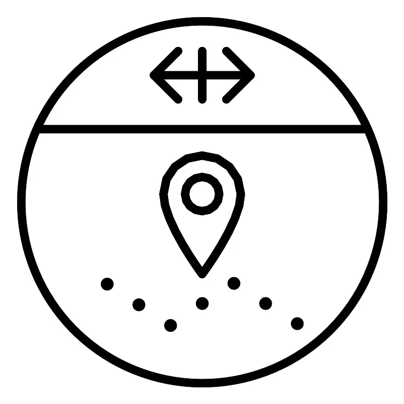 <svg width="800px" height="800px" viewBox="0 0 48 48" xmlns="http://www.w3.org/2000/svg"><defs><style>.a{fill:none;stroke:#000000;stroke-linecap:round;stroke-linejoin:round;}.b{fill:#000000;}</style></defs><path class="a" d="M26.8706,6.0412l2.8647,2.8677-2.8677,2.8676m-5.7382,0L18.2647,8.9089l2.8677-2.8677"/><line class="a" x1="18.2647" y1="8.9089" x2="29.7353" y2="8.9089"/><line class="a" x1="24" y1="6.0412" x2="24" y2="11.7765"/><circle class="a" cx="24" cy="24" r="21.5"/><line class="a" x1="4.4207" y1="15.3178" x2="43.5793" y2="15.3178"/><path class="a" d="M28.5865,23.0284a4.5989,4.5989,0,0,0-9.1977,0c0,3.3737,4.5989,9.5126,4.5989,9.5126S28.5865,26.4021,28.5865,23.0284Z"/><circle class="a" cx="23.9877" cy="23.0284" r="2.0269"/><circle class="b" cx="24" cy="36.0304" r="0.75"/><circle class="b" cx="20.2362" cy="38.6399" r="0.75"/><circle class="b" cx="16.4724" cy="36.1828" r="0.75"/><circle class="b" cx="12.7086" cy="33.7257" r="0.75"/><circle class="b" cx="27.7638" cy="33.6379" r="0.75"/><circle class="b" cx="31.5276" cy="36.0304" r="0.75"/><circle class="b" cx="35.2914" cy="38.4229" r="0.75"/></svg>