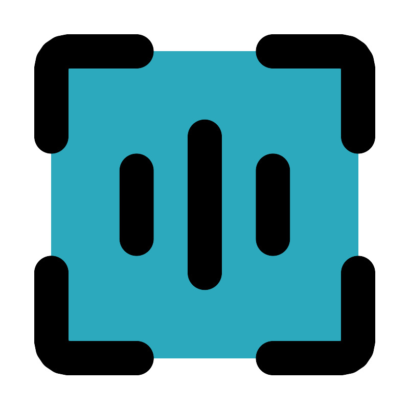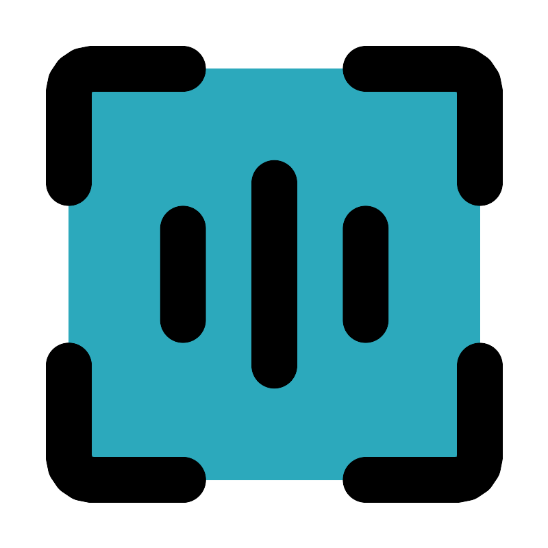 <svg fill="#000000" width="800px" height="800px" viewBox="0 0 24 24" id="scan-alt" data-name="Flat Line" xmlns="http://www.w3.org/2000/svg" class="icon flat-line"><rect id="secondary" x="3" y="3" width="18" height="18" rx="1" style="fill: rgb(44, 169, 188); stroke-width: 2;"></rect><path id="primary" d="M12,16V8M8,14V10m8,4V10" style="fill: none; stroke: rgb(0, 0, 0); stroke-linecap: round; stroke-linejoin: round; stroke-width: 2;"></path><path id="primary-2" data-name="primary" d="M8,21H4a1,1,0,0,1-1-1V16" style="fill: none; stroke: rgb(0, 0, 0); stroke-linecap: round; stroke-linejoin: round; stroke-width: 2;"></path><path id="primary-3" data-name="primary" d="M16,21h4a1,1,0,0,0,1-1V16" style="fill: none; stroke: rgb(0, 0, 0); stroke-linecap: round; stroke-linejoin: round; stroke-width: 2;"></path><path id="primary-4" data-name="primary" d="M3,16v4a1,1,0,0,0,1,1H8" style="fill: none; stroke: rgb(0, 0, 0); stroke-linecap: round; stroke-linejoin: round; stroke-width: 2;"></path><path id="primary-5" data-name="primary" d="M3,8V4A1,1,0,0,1,4,3H8" style="fill: none; stroke: rgb(0, 0, 0); stroke-linecap: round; stroke-linejoin: round; stroke-width: 2;"></path><path id="primary-6" data-name="primary" d="M21,8V4a1,1,0,0,0-1-1H16" style="fill: none; stroke: rgb(0, 0, 0); stroke-linecap: round; stroke-linejoin: round; stroke-width: 2;"></path></svg>