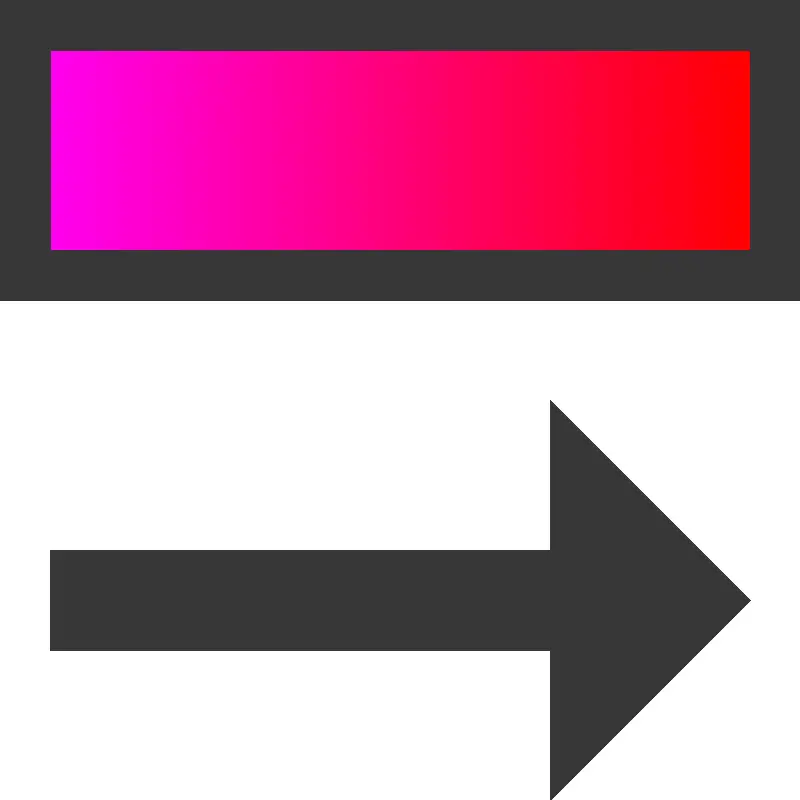 <svg width="800px" height="800px" viewBox="0 0 16 16" xmlns:dc="http://purl.org/dc/elements/1.1/" xmlns:cc="http://creativecommons.org/ns#" xmlns:rdf="http://www.w3.org/1999/02/22-rdf-syntax-ns#" xmlns="http://www.w3.org/2000/svg" id="svg13" version="1.1"><metadata id="metadata17"><rdf:RDF><cc:Work><dc:format>image/svg+xml</dc:format><dc:type rdf:resource="http://purl.org/dc/dcmitype/StillImage"/><dc:title/><dc:date>2021</dc:date><dc:creator><cc:Agent><dc:title>Timothée Giet</dc:title></cc:Agent></dc:creator><cc:license rdf:resource="http://creativecommons.org/licenses/by-sa/4.0/"/></cc:Work><cc:License rdf:about="http://creativecommons.org/licenses/by-sa/4.0/"><cc:permits rdf:resource="http://creativecommons.org/ns#Reproduction"/><cc:permits rdf:resource="http://creativecommons.org/ns#Distribution"/><cc:requires rdf:resource="http://creativecommons.org/ns#Notice"/><cc:requires rdf:resource="http://creativecommons.org/ns#Attribution"/><cc:permits rdf:resource="http://creativecommons.org/ns#DerivativeWorks"/><cc:requires rdf:resource="http://creativecommons.org/ns#ShareAlike"/></cc:License></rdf:RDF></metadata><defs id="defs7"><linearGradient gradientUnits="userSpaceOnUse" gradientTransform="rotate(-90 -.5 .5)" y2="7" y1="7" x2="15.5" x1="0.5" id="a"><stop style="stop-color:red;stop-opacity:1" id="stop2" offset="0" stop-color="red"/><stop stop-color="#ff0" offset="0.16666667" id="stop846" style="stop-color:#ff0;stop-opacity:1"/><stop stop-color="#0f0" offset="0.33333334" id="stop862" style="stop-color:#0f0;stop-opacity:1"/><stop style="stop-color:#0ff;stop-opacity:1" id="stop844" offset="0.5" stop-color="#0ff"/><stop stop-color="#00f" offset="0.66666669" id="stop848" style="stop-color:#00f;stop-opacity:1"/><stop style="stop-color:#f0f;stop-opacity:1" id="stop850" offset="0.83333331" stop-color="#f0f"/><stop style="stop-color:red;stop-opacity:1" id="stop4" offset="1" stop-color="red"/></linearGradient></defs><path style="fill:#373737;fill-opacity:1" id="path9" d="m15 12-4-4v3H1v2h10v3z"/><path id="rect11" d="M.5-15.5h5.034v15H.5z" style="fill:url(#a);stroke:none;stroke-dashoffset:1.14999998" transform="rotate(90)"/><path style="fill:#373737;fill-opacity:1;stroke:none;stroke-width:.5;stroke-linejoin:bevel;stroke-miterlimit:4;stroke-dasharray:none;stroke-dashoffset:0;stroke-opacity:1" d="M0 0v6h16V0zm1 1h14v4H1z" id="rect819"/></svg>