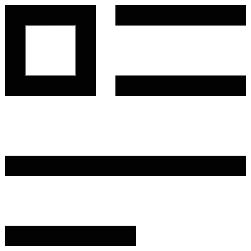 <svg width="800px" height="800px" viewBox="0 0 24 24" id="Layer_1" data-name="Layer 1" xmlns="http://www.w3.org/2000/svg"><defs><style>.cls-1{fill:none;stroke:#020202;stroke-miterlimit:10;stroke-width:1.92px;}</style></defs><rect class="cls-1" x="1.46" y="1.46" width="6.71" height="6.71"/><line class="cls-1" x1="11.04" y1="1.46" x2="23.5" y2="1.46"/><line class="cls-1" x1="11.04" y1="8.17" x2="23.5" y2="8.17"/><line class="cls-1" x1="0.5" y1="15.83" x2="23.5" y2="15.83"/><line class="cls-1" x1="0.5" y1="22.54" x2="12.96" y2="22.54"/></svg>