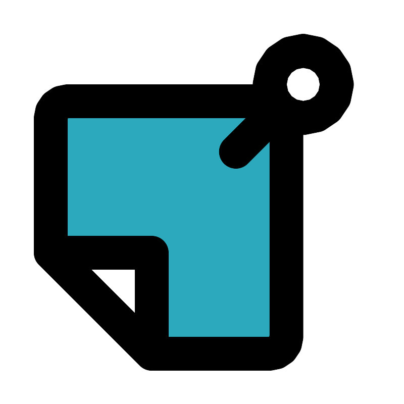 <svg fill="#000000" width="800px" height="800px" viewBox="0 0 24 24" id="sticky-notes-9" data-name="Flat Line" xmlns="http://www.w3.org/2000/svg" class="icon flat-line"><path id="secondary" d="M17,7V20a1,1,0,0,1-1,1H9V15H3V8A2,2,0,0,1,5,6H16A1,1,0,0,1,17,7Z" style="fill: rgb(44, 169, 188); stroke-width: 2;"></path><path id="primary" d="M17,7V20a1,1,0,0,1-1,1H9L3,15V7A1,1,0,0,1,4,6H16" style="fill: none; stroke: rgb(0, 0, 0); stroke-linecap: round; stroke-linejoin: round; stroke-width: 2;"></path><path id="primary-2" data-name="primary" d="M9,15v6L3,15ZM20,5a2,2,0,0,1-2,2h0a2,2,0,0,1-2-2h0a2,2,0,0,1,2-2h0a2,2,0,0,1,2,2ZM16.59,6.41,14,9" style="fill: none; stroke: rgb(0, 0, 0); stroke-linecap: round; stroke-linejoin: round; stroke-width: 2;"></path></svg>