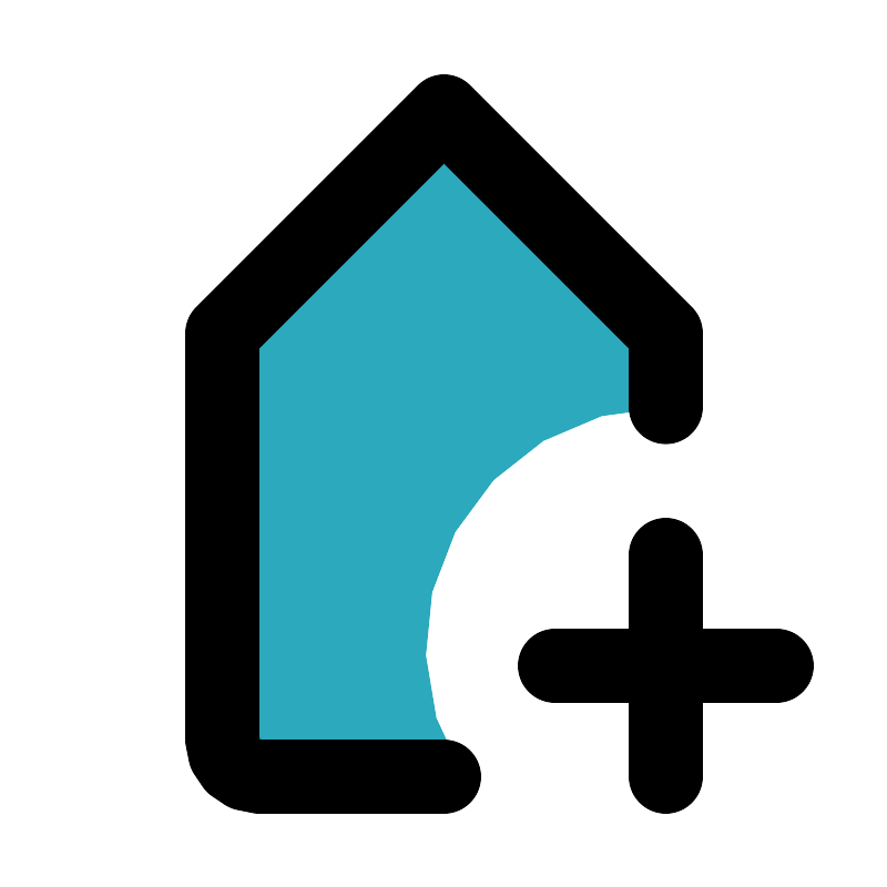 <svg fill="#000000" width="800px" height="800px" viewBox="0 0 24 24" id="tag-add" data-name="Flat Line" xmlns="http://www.w3.org/2000/svg" class="icon flat-line"><path id="secondary" d="M18,9v2a6.5,6.5,0,0,0-5.48,10H7a1,1,0,0,1-1-1V9l6-6Z" style="fill: rgb(44, 169, 188); stroke-width: 2;"></path><path id="primary" d="M18,15v6m3-3H15" style="fill: none; stroke: rgb(0, 0, 0); stroke-linecap: round; stroke-linejoin: round; stroke-width: 2;"></path><path id="primary-2" data-name="primary" d="M12,21H7a1,1,0,0,1-1-1V9l6-6,6,6v2" style="fill: none; stroke: rgb(0, 0, 0); stroke-linecap: round; stroke-linejoin: round; stroke-width: 2;"></path></svg>