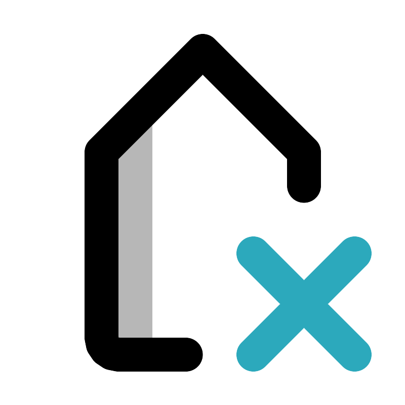 <svg width="800px" height="800px" viewBox="0 0 24 24" id="tag-close" xmlns="http://www.w3.org/2000/svg" class="icon multi-color"><title style="stroke-width: 2;">tag close</title><path id="tertiary-fill" d="M9,6V21H7a1,1,0,0,1-1-1V9Z" style="fill: #b7b7b7; stroke-width: 2;"></path><path id="primary-stroke" d="M11,21H7a1,1,0,0,1-1-1V9l6-6,6,6v2" style="fill: none; stroke: rgb(0, 0, 0); stroke-linecap: round; stroke-linejoin: round; stroke-width: 2;"></path><path id="secondary-stroke" d="M15,21l6-6m0,6-6-6" style="fill: none; stroke: rgb(44, 169, 188); stroke-linecap: round; stroke-linejoin: round; stroke-width: 2;"></path></svg>