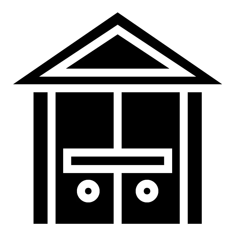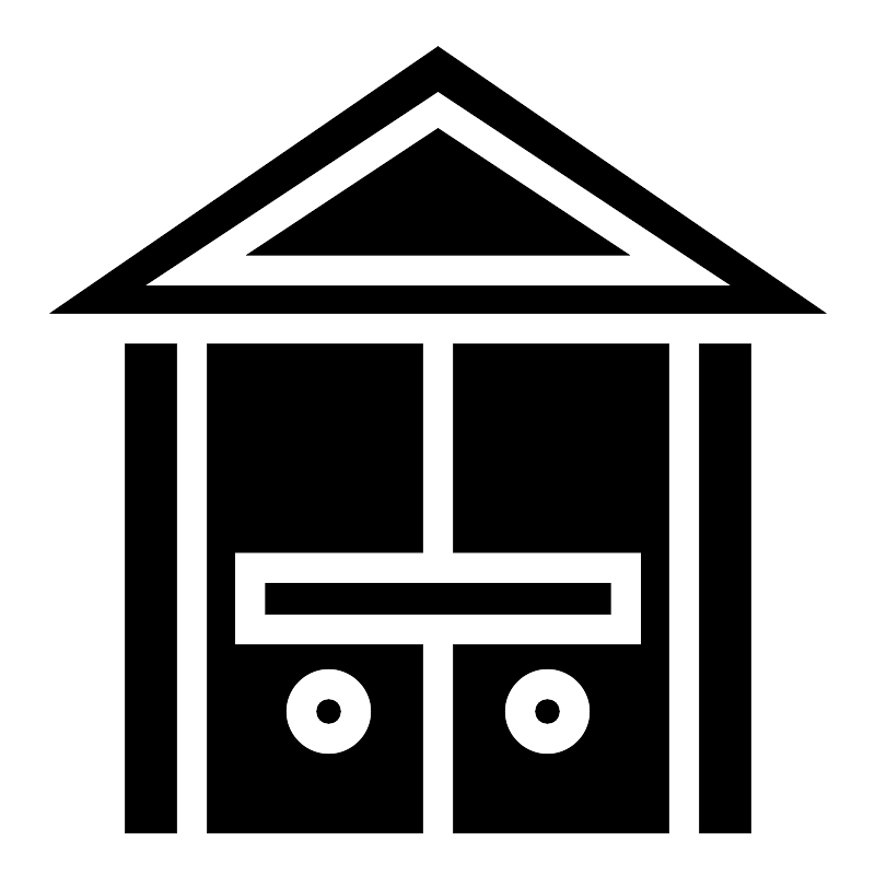 <svg width="800px" height="800px" viewBox="0 0 512 512" xmlns="http://www.w3.org/2000/svg"><path fill="#000000" d="M256 26.92L28.98 183H483L256 26.92zm0 26.29L427.9 167H84.1L256 53.21zm0 21.58L143.9 149h224.2L256 74.79zM73 201v286h30V201H73zm48 0v286h126V377H137v-54h110V201H121zm144 0v122h110v54H265v110h126V201H265zm144 0v286h30V201h-30zM155 341v18h202v-18H155zm37 50c13.7 0 25 11.3 25 25s-11.3 25-25 25-25-11.3-25-25 11.3-25 25-25zm128 0c13.7 0 25 11.3 25 25s-11.3 25-25 25-25-11.3-25-25 11.3-25 25-25zm-128 18c-4 0-7 3-7 7s3 7 7 7 7-3 7-7-3-7-7-7zm128 0c-4 0-7 3-7 7s3 7 7 7 7-3 7-7-3-7-7-7z"/></svg>