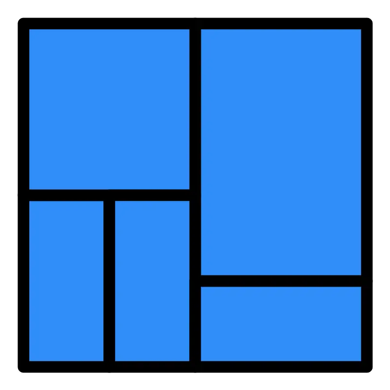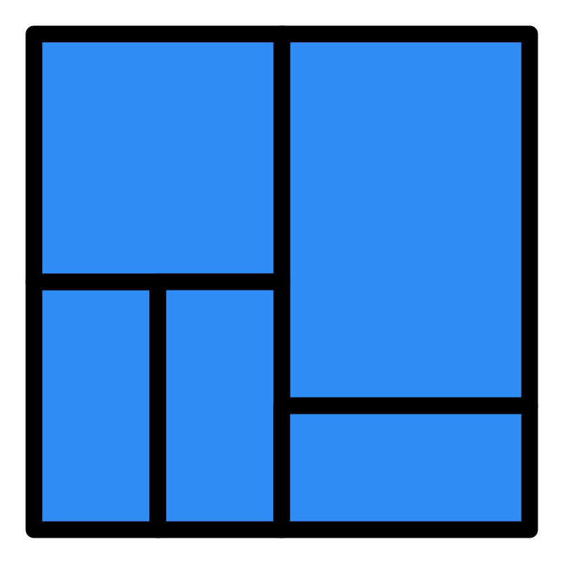 <svg width="800px" height="800px" viewBox="0 -1.5 2253 2253" style="fill-rule:evenodd;clip-rule:evenodd;stroke-linecap:round;stroke-linejoin:round;stroke-miterlimit:1.5;" version="1.1" xml:space="preserve" xmlns="http://www.w3.org/2000/svg" xmlns:serif="http://www.serif.com/" xmlns:xlink="http://www.w3.org/1999/xlink"><rect height="2250" id="treemap_chart" style="fill:none;" width="2250" x="1.288" y="0"/><rect height="991.667" style="fill:#308df8;stroke:#000000;stroke-width:66.67px;" width="495.833" x="134.621" y="1125"/><rect height="1487.5" style="fill:#308df8;stroke:#000000;stroke-width:66.67px;" width="991.667" x="1126.29" y="133.333"/><rect height="991.667" style="fill:#308df8;stroke:#000000;stroke-width:66.67px;" width="991.667" x="134.621" y="133.333"/><rect height="991.667" style="fill:#308df8;stroke:#000000;stroke-width:66.67px;" width="495.833" x="630.454" y="1125"/><rect height="495.833" style="fill:#308df8;stroke:#000000;stroke-width:66.67px;" width="991.667" x="1126.29" y="1620.83"/></svg>