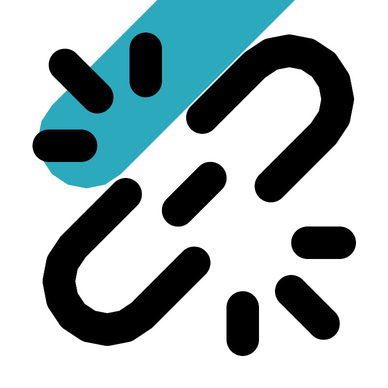<svg fill="#000000" width="800px" height="800px" viewBox="0 0 24 24" id="unlnk-alt-2" data-name="Flat Line" xmlns="http://www.w3.org/2000/svg" class="icon flat-line"><rect id="secondary" x="1.29" y="8.75" width="21.92" height="6" rx="3" transform="translate(-4.72 12.1) rotate(-45)" style="fill: rgb(44, 169, 188); stroke-width: 2;"></rect><path id="primary" d="M9,5V3M5,9H3m16,6h2m-6,4v2M4,4,6,6M20,20l-2-2m-7-5,2-2" style="fill: none; stroke: rgb(0, 0, 0); stroke-linecap: round; stroke-linejoin: round; stroke-width: 2;"></path><path id="primary-2" data-name="primary" d="M12,16.24,8.74,19.5a3,3,0,0,1-4.24,0h0a3,3,0,0,1,0-4.24L7.76,12" style="fill: none; stroke: rgb(0, 0, 0); stroke-linecap: round; stroke-linejoin: round; stroke-width: 2;"></path><path id="primary-3" data-name="primary" d="M12.5,7.26,15.76,4A3,3,0,0,1,20,4h0a3,3,0,0,1,0,4.24L16.74,11.5" style="fill: none; stroke: rgb(0, 0, 0); stroke-linecap: round; stroke-linejoin: round; stroke-width: 2;"></path></svg>