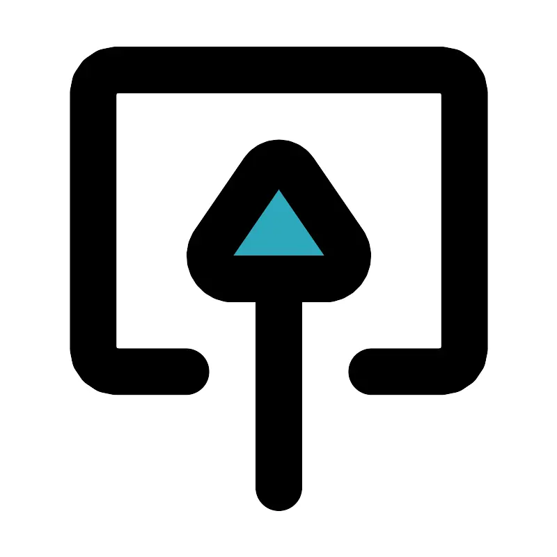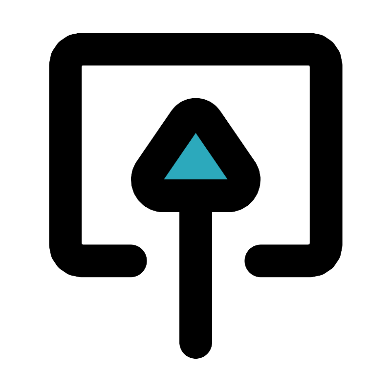 <svg fill="#000000" width="800px" height="800px" viewBox="0 0 24 24" id="upload-8" data-name="Flat Line" xmlns="http://www.w3.org/2000/svg" class="icon flat-line"><path id="secondary" d="M11.31,7.38,9.17,10.5A1,1,0,0,0,9.86,12h4.28a1,1,0,0,0,.69-1.5L12.69,7.38A.82.82,0,0,0,11.31,7.38Z" style="fill: rgb(44, 169, 188); stroke-width: 2;"></path><path id="primary" d="M12,21V12m-.69-4.62L9.17,10.5A1,1,0,0,0,9.86,12h4.28a1,1,0,0,0,.69-1.5L12.69,7.38A.82.82,0,0,0,11.31,7.38Z" style="fill: none; stroke: rgb(0, 0, 0); stroke-linecap: round; stroke-linejoin: round; stroke-width: 2;"></path><path id="primary-2" data-name="primary" d="M8,16H5a1,1,0,0,1-1-1V4A1,1,0,0,1,5,3H19a1,1,0,0,1,1,1V15a1,1,0,0,1-1,1H16" style="fill: none; stroke: rgb(0, 0, 0); stroke-linecap: round; stroke-linejoin: round; stroke-width: 2;"></path></svg>