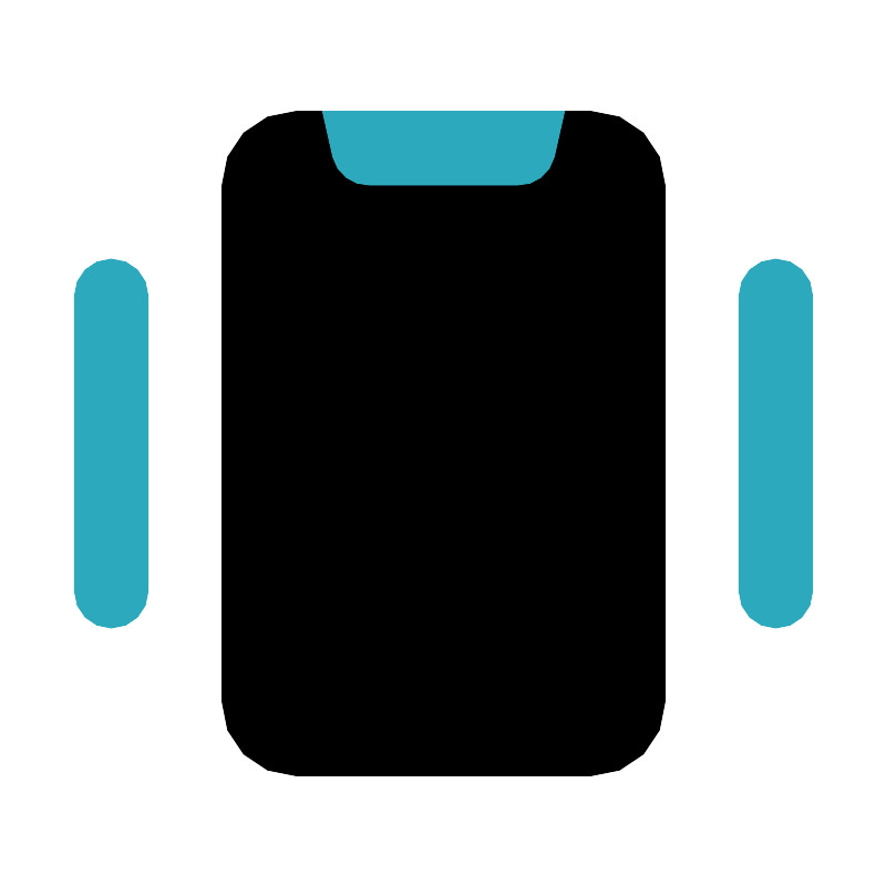 <svg fill="#000000" width="800px" height="800px" viewBox="0 0 24 24" id="vibrate" data-name="Flat Color" xmlns="http://www.w3.org/2000/svg" class="icon flat-color"><rect id="primary" x="6" y="3" width="12" height="18" rx="2" style="fill: rgb(0, 0, 0);"></rect><path id="secondary" d="M21,17a1,1,0,0,1-1-1V8a1,1,0,0,1,2,0v8A1,1,0,0,1,21,17ZM3,17a1,1,0,0,1-1-1V8A1,1,0,0,1,4,8v8A1,1,0,0,1,3,17ZM8.72,3,9,4.24A1,1,0,0,0,10,5h4a1,1,0,0,0,1-.76L15.28,3Z" style="fill: rgb(44, 169, 188);"></path></svg>