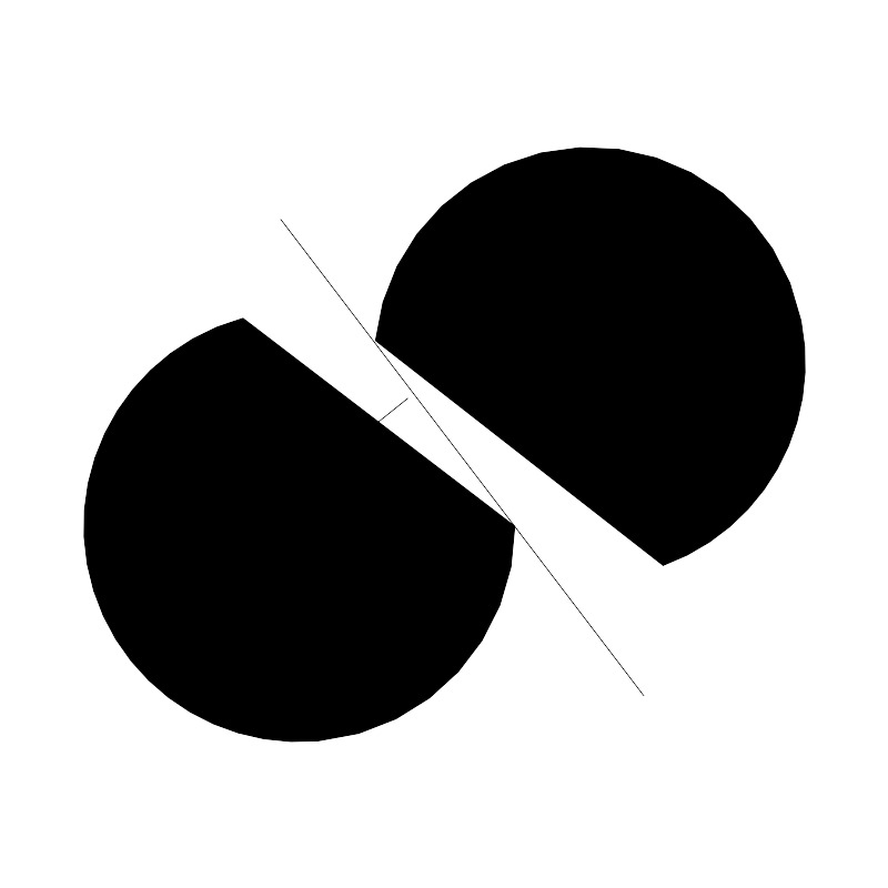 <svg width="800px" height="800px" viewBox="0 0 48 48" xmlns="http://www.w3.org/2000/svg"><defs><style>.a,.b{fill:none;stroke:#000000;}.a{stroke-linecap:round;stroke-linejoin:round;}</style></defs><path class="a" d="M27.8006,28.4143A11.65,11.65,0,1,1,13.1058,17.17"/><path class="a" d="M20.2624,18.3811A11.6493,11.6493,0,1,1,35.8147,30.5385"/><path class="b" d="M15.1526,11.8356l19.614,25.7391"/><path class="b" d="M14.7649,27.3186,22.0043,21.51"/><circle class="a" cx="12.8712" cy="28.6859" r="2.288"/></svg>