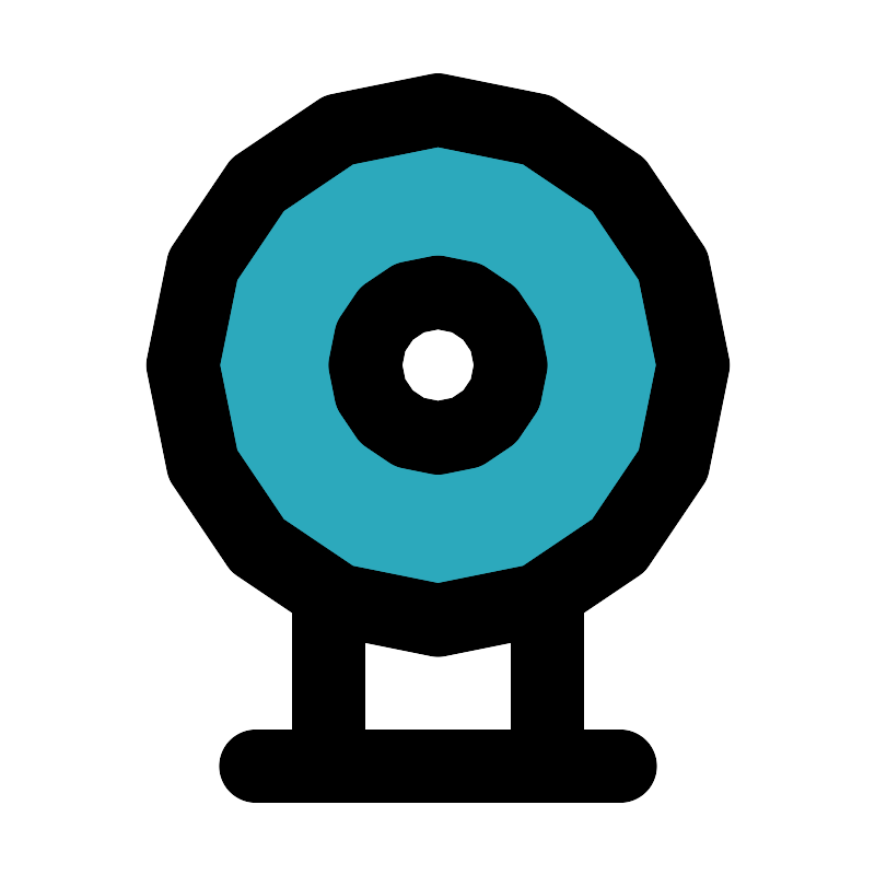 <svg fill="#000000" width="800px" height="800px" viewBox="0 0 24 24" id="webcam-2" data-name="Flat Line" xmlns="http://www.w3.org/2000/svg" class="icon flat-line"><path id="secondary" d="M12,3a7,7,0,1,0,7,7A7,7,0,0,0,12,3Zm0,9a2,2,0,1,1,2-2A2,2,0,0,1,12,12Z" style="fill: rgb(44, 169, 188); stroke-width: 2;"></path><path id="primary" d="M14,10a2,2,0,1,1-2-2A2,2,0,0,1,14,10ZM9,21V16.45m6-.09V21m2,0H7M19,10a7,7,0,1,0-7,7A7,7,0,0,0,19,10Z" style="fill: none; stroke: rgb(0, 0, 0); stroke-linecap: round; stroke-linejoin: round; stroke-width: 2;"></path></svg>