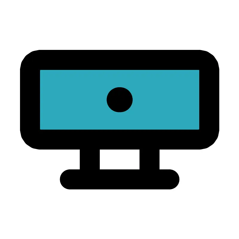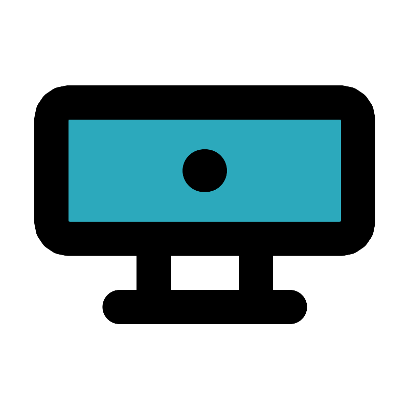 <svg fill="#000000" width="800px" height="800px" viewBox="0 0 24 24" id="webcam" data-name="Flat Line" xmlns="http://www.w3.org/2000/svg" class="icon flat-line"><rect id="secondary" x="3" y="6" width="18" height="8" rx="1" style="fill: rgb(44, 169, 188); stroke-width: 2;"></rect><line id="primary-upstroke" x1="11.95" y1="10" x2="12.05" y2="10" style="fill: none; stroke: rgb(0, 0, 0); stroke-linecap: round; stroke-linejoin: round; stroke-width: 2.5;"></line><path id="primary" d="M20,14H4a1,1,0,0,1-1-1V7A1,1,0,0,1,4,6H20a1,1,0,0,1,1,1v6A1,1,0,0,1,20,14Zm-5,0H9v4h6Zm2,4H7" style="fill: none; stroke: rgb(0, 0, 0); stroke-linecap: round; stroke-linejoin: round; stroke-width: 2;"></path></svg>